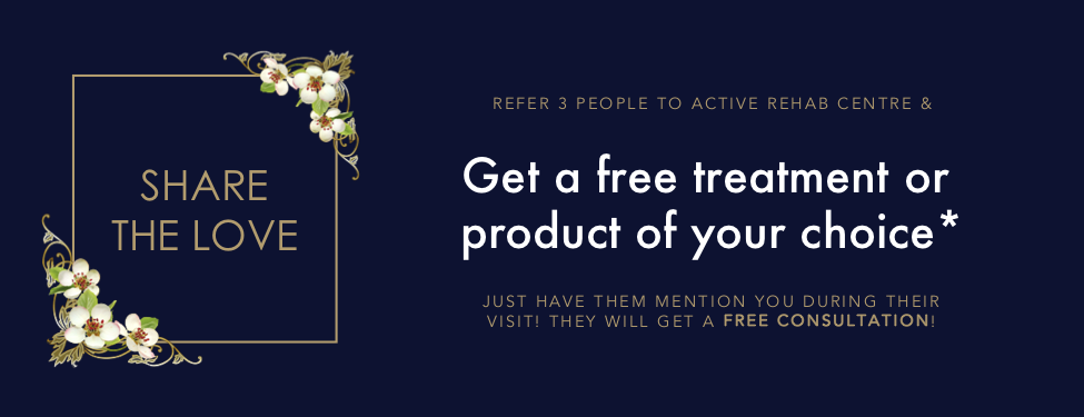 Refer at least 3 people to Active Rehab Centre and you’ll get a free treatment or product of your choice*! At the same time, those you refer will receive a free consultation!